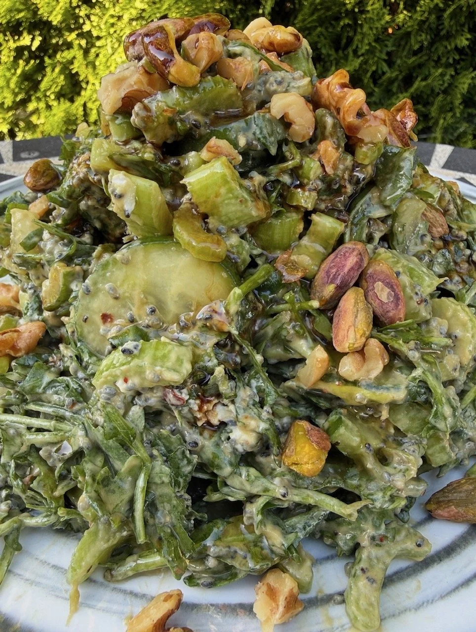 A salad made with 3 ounces of arugula, 3 Persian cucumbers, 3 long celery stalks, one avocado, 2 ounces of goat cheese, a handful of pistachios and walnuts, a drizzle of olive oil, balsamic vinegar, and honey, a pinch of salt and pepper, and the star ingredient — ¼ cup of Zen Basil seeds.