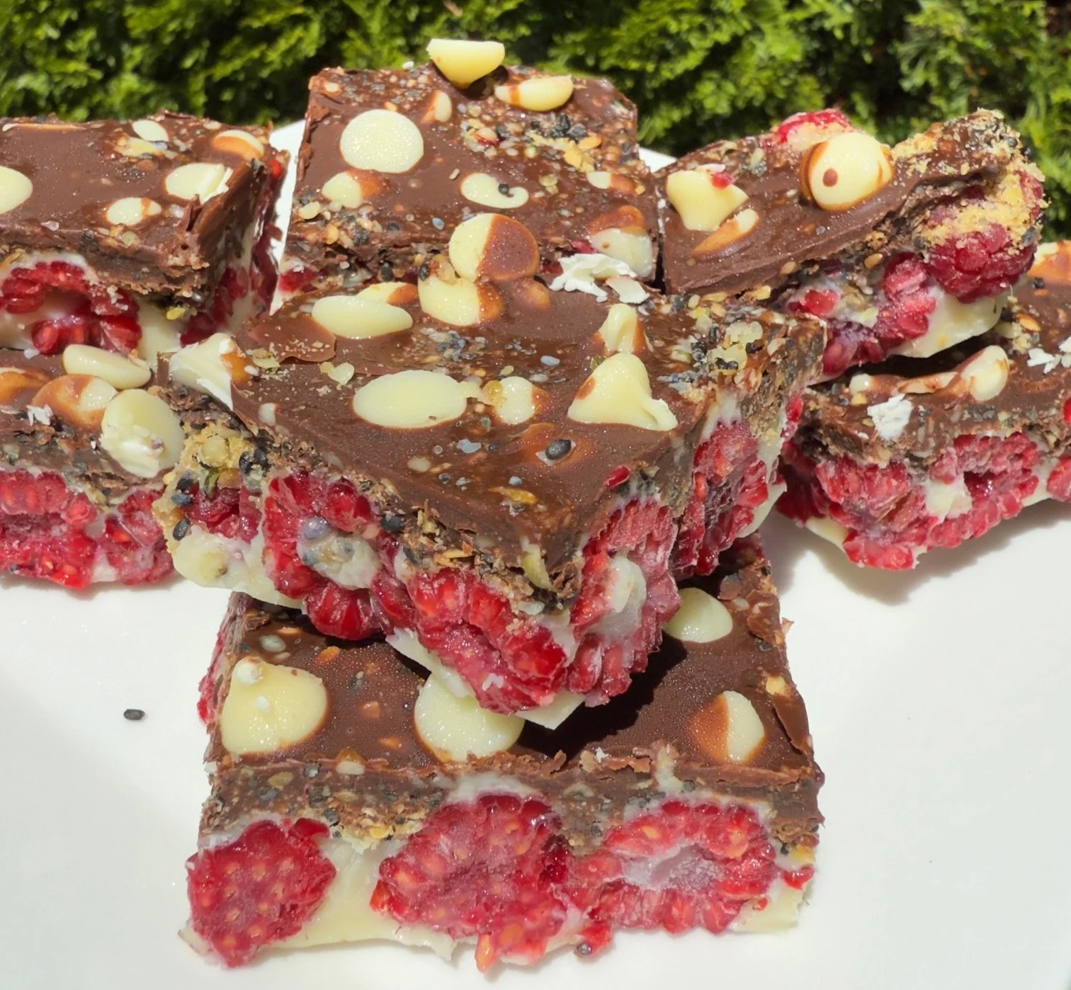 3. Melt white chocolate until smooth and pour it over the raspberries.