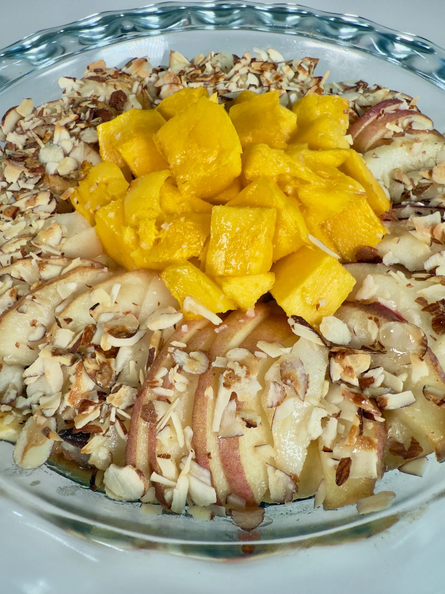 • Arrange sliced bananas, peaches, pears, and mango over the caramel layer.