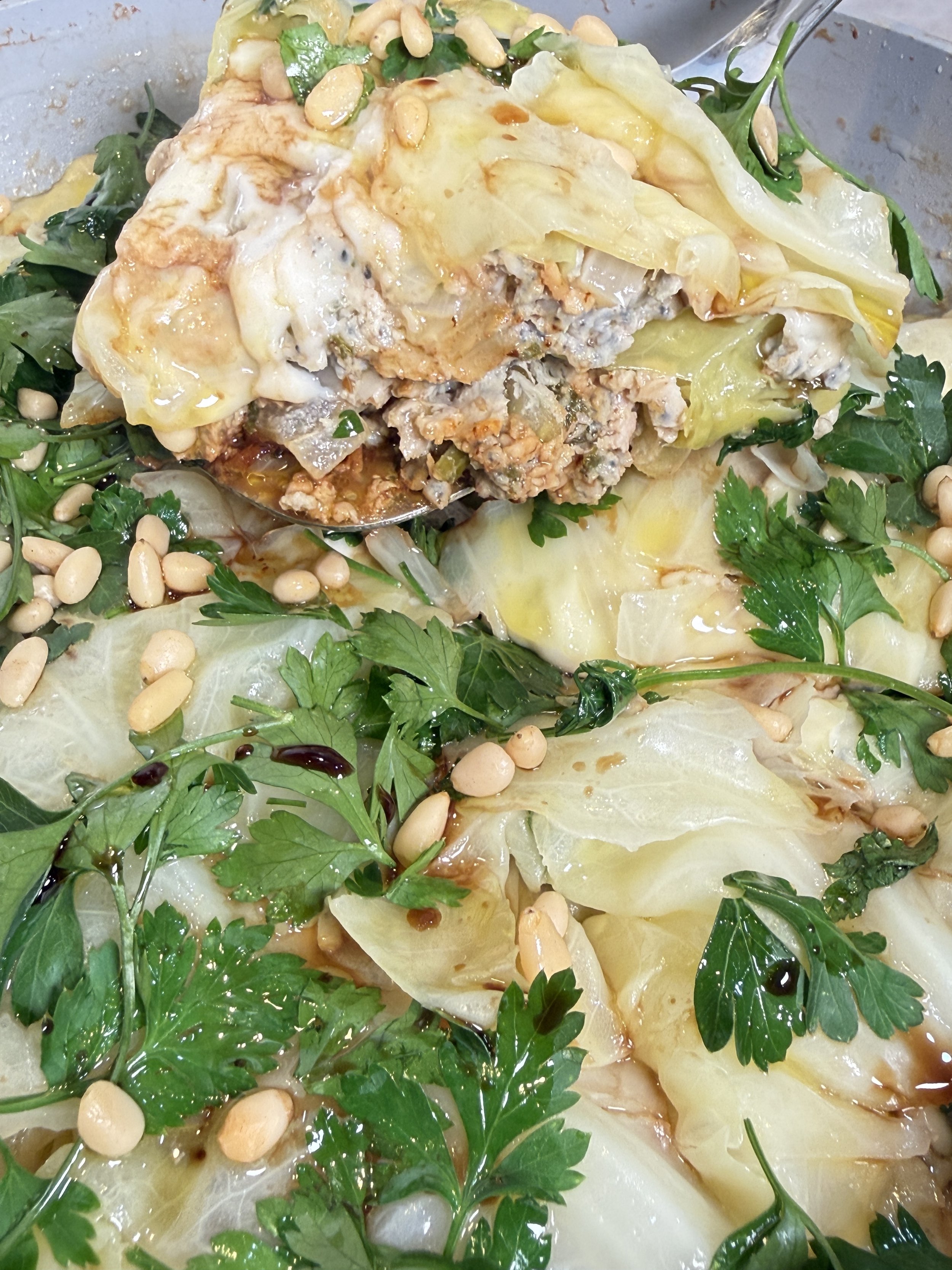 Lightly steam or soften cabbage leaves so they’re flexible (this makes layering easier)