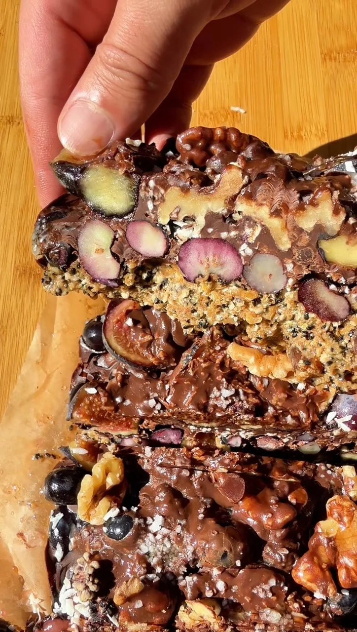 Spread the Bio Protein–almond butter mixture evenly over the date layer.Fruit & crunch